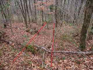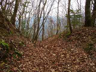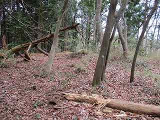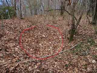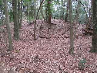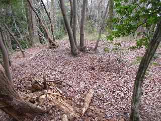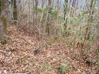 この部分の北側には比較的平坦な尾根が延びていて、簡単に郭として削平できそうな場所であるのだが、こちらの尾根はまったく加工されていない。この辺りまで手が及んでいなかったようで、城そのものが急造されたことを思わせる部分である。