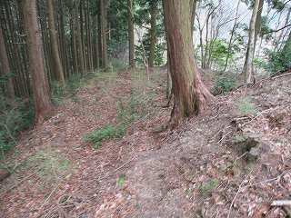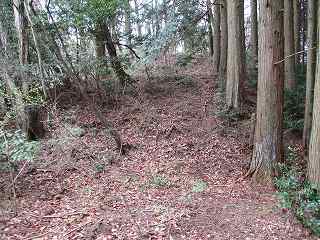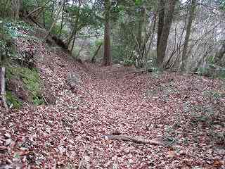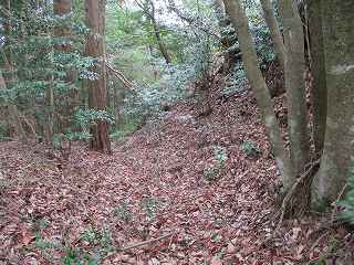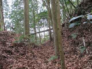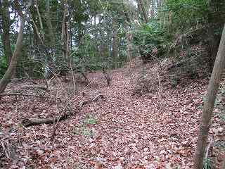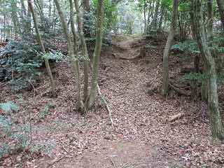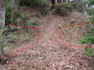 そのまま坂道を登って行くと、道は右手に大きくカーブしており、その部分に堀切が掘られている。ここからが城域内になっている。