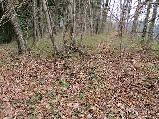 そこから尾根をひたすら登って行くと、やがて最初の堀切が見えてくる。といっても、深さは1mほどもなく、とても防御性は感じられない。側面部にもやや削った跡が認められるので、かろうじて堀切かもしれないと認識できる程度のものである。