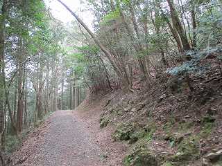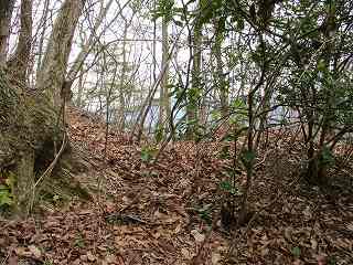 そのまま林道を進んで行くと、道は急斜面に差しかかる。その時に右手の上に削平された平場が見えているのだが、城の本体からはかなり離れている。郭であるのかどうかは不明である。