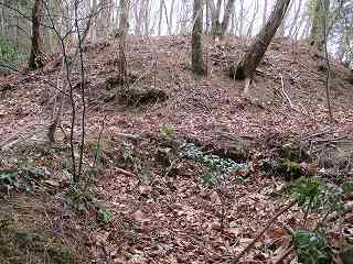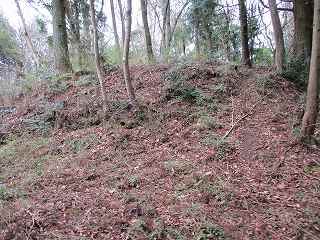 | その先の郭から見た1郭城塁。 | 奥の城に続く尾根下から見た2郭城塁。手前が小さな堀切状になっている。 |