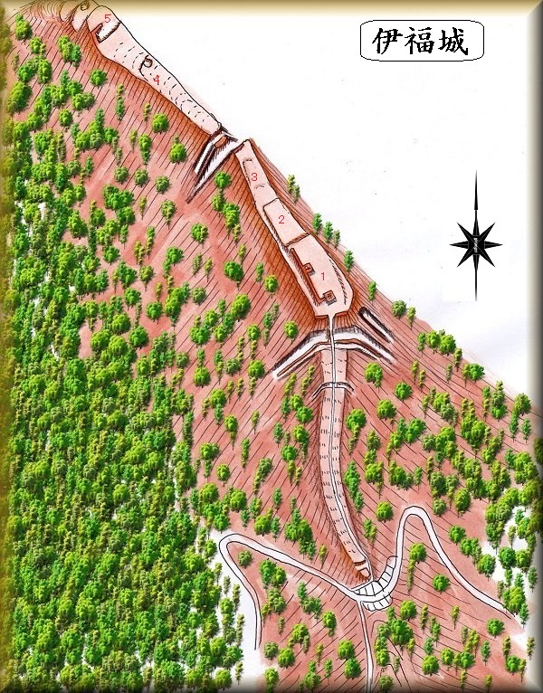 伊福城は、二重堀切などはしっかりと形成されているが、傾斜地形のままの箇所も多い。緊急時の逃げ込み場所として、構築されたものであったと考えられる。