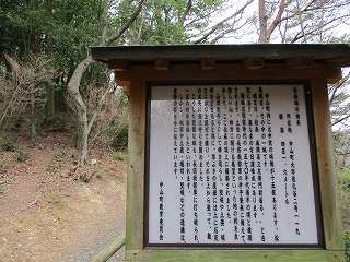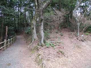 降ったところに案内板が設置されており、その先からが城域である。ここで遊歩道が左右2本に分かれている。左側の方が登城道につながっていそうな気がしたので、左側に進んで行ったのだが、実際にはこちら側に登城道はない。