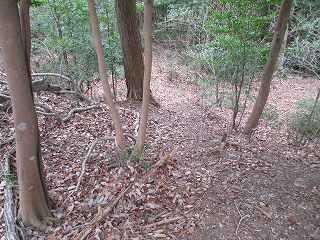 登り始めてすぐの先端部分に堀切状の区画が見られた。一見して遺構のように見えるのだが、城の本体からはかなり離れている。確実に遺構であるということはできない。