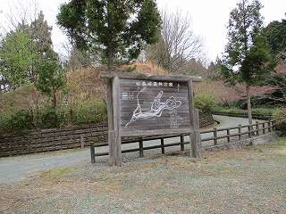 この林道は舗装されたちゃんとした道なので、安心して車を運転できる。そうして進んで行くと、まず「根中城→」という案内表示が見えてきた。ここは後で寄るので、とりあえず素通り。そのまま進んで行くと、大きな看板が立っている。