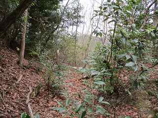 | 西側の通路。この上に西側下の腰曲輪がある。 | 北側先端の堀切。 |