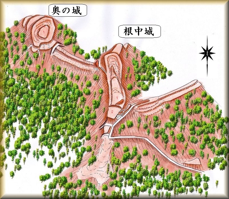 あるいは、もともとがこちらが本来の根中城であったものを、城を西側に拡張していったので、一城別郭のような構造になってしまったものかもしれない。