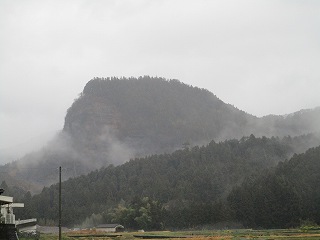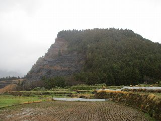 | 民家の石垣。この上こそが居館であったかもしれない。 | 集落に向かう途中から見える城山。削られた部分が岩肌であることが分かる。山中から石材を算出できたようだ。 |