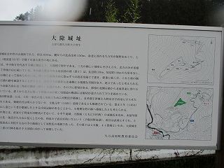 | 大除城を遠望する。非常に特徴的な山なので、かなり遠くからでも城山であるということが分かる。 | 集落入口付近に立てられている案内板。 |