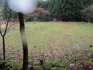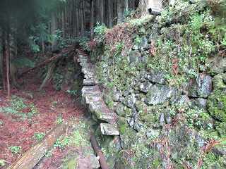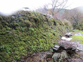 | 麓の民家の脇から登って行くと、このような平場が見られた。居館の跡であろうか。 | 麓の民家の石垣。側面部に石を突き出した階段が珍しい。 |
