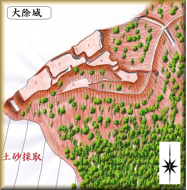 『図説中世城郭事典』の図にのみ、3郭からかなり北西に降りていったところにも石積みで囲まれた段郭が存在描かれているが、こちらは砕石によって、現在では失われてしまっているようである。
