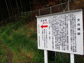 志河川ダムの北西にそびえている比高100mほどの山稜が文台城の跡である。すぐ南側には志河川ダムがあり、城の南側を守る天然堀となっている。