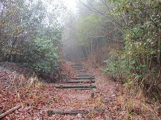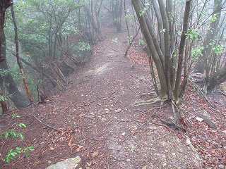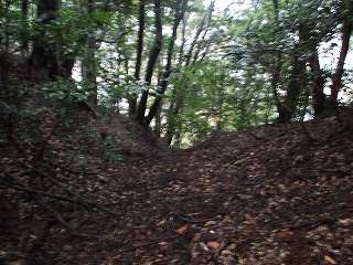 | 山稜で折り返す辺りから階段となる。 | 1郭東側下の堀切。 |