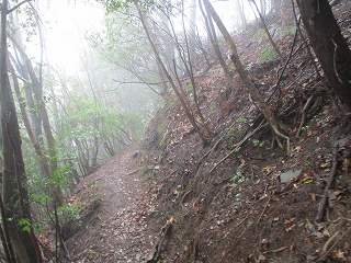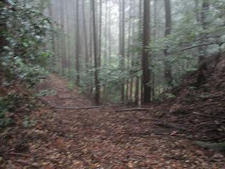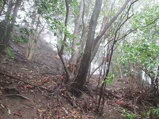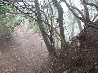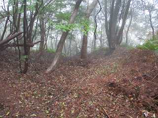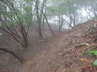 郭はすぐ上なので、通常ならどこからでも登れるのだが、雨が激しくなってきた。傘を差しながら登れるところがないか、林道沿いに進んで行くと、西側の堀切のところまで来た。この堀切から城内に登ってみた。