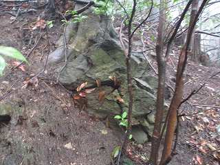 | 1郭城塁の側面部。獣道のような道で、左下は急斜面である。 | 1郭城塁側面部にあった石積み。 |