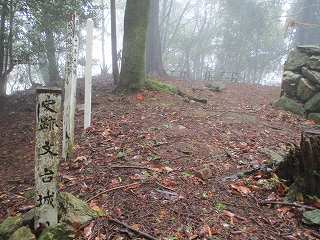 | 1郭に祭られている祠。 | その脇には朽ちかけた城址標柱があった。 |