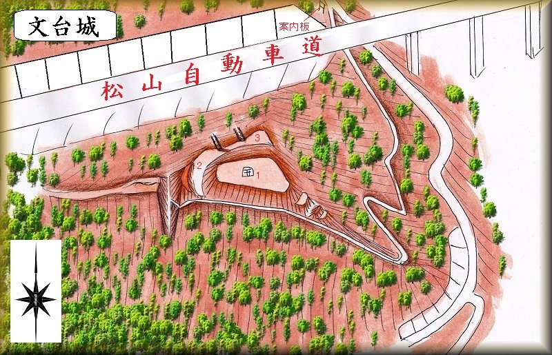 | 文台城はかなり長い期間にわたって使用された城郭である。 平安時代末期の治承4年(1180)、平家追討の兵をあげた源頼朝に呼応して、伊予の河野通清は、高縄山城において平家討伐のために挙兵した。そして、伊予国府の平維盛の目代を攻撃した。 目代は国府を脱出して赤滝城に籠城する。さらに目代は文台城と大熊城を拠点として河野氏に対抗した。 これに対して河野通清は、文台城と大熊城を攻撃して両城共に攻め落とした。さらに進んで赤滝城をも落城させると、、目代方の勢力は一掃されてしまうことになる。 鎌倉時代末期には、河野一族の得能通時が、鎌倉方の赤橋重時を攻撃した。重時は、文台城に籠城したが、城は攻め落とされてしまったという。 時代は降って、戦国時代になると、剣山城主であった黒川通博が、文台城を修築して、剣山城の支城とした。文台状には黒川氏の家臣の兼頭修理亮・臼坂弾正・武田備後守らが入城して守備していた。 天正13年(1585)、秀吉の四国攻めが始まると、小早川隆景らの軍勢が伊予に攻め寄せてきた。文台城や剣山城は、この時に攻め落とされてしまった。その後は廃城になったものと思われる。 |