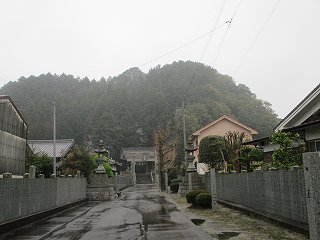 | 北側から見る城山。比高30mほどだが、独立山なので、遠くからでも一目で分かる。 | 登り口の山門。神社に山門があるのは珍しい。 |