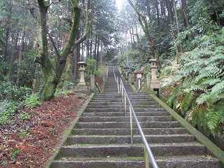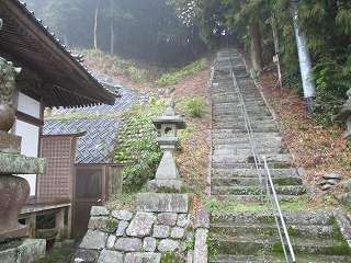 | 医王院から城址方向を見る。寺院背後の山稜に畝状竪堀が見えている。 | 医王院脇から、気の遠くなるような階段を登って2郭を目指す。 |