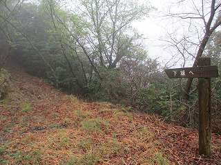休憩所の背後には山道が付けられており、それを南東側に進んで行くと、途中で下城への分岐点があり、そこにも案内が設置されていた。