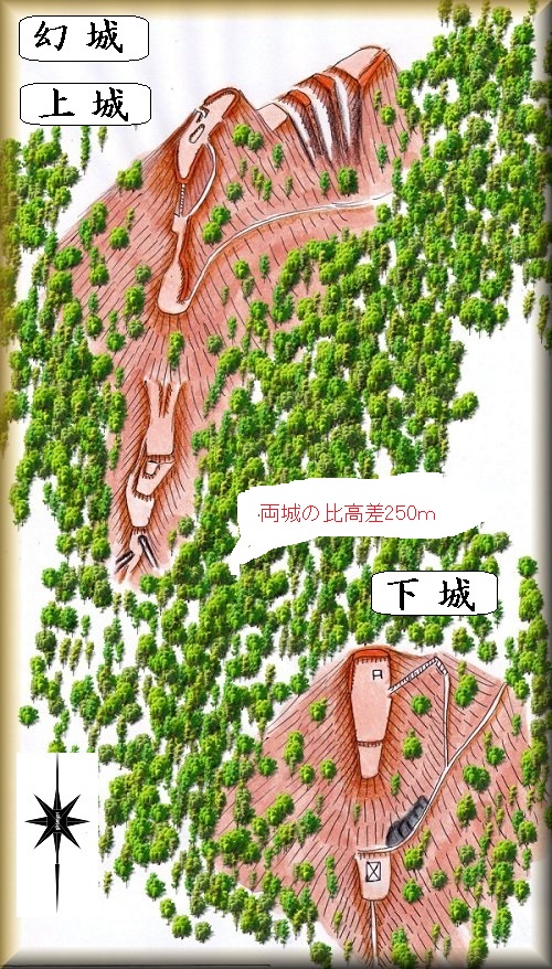 1枚の絵に納めたため、右の鳥瞰図では上城と下城とが近い位置にあるようになってしまっているが、実際には上城と下城の間には250mほどの比高差、直線距離にして1.2kmほどもあり、けっこう離れている。