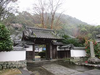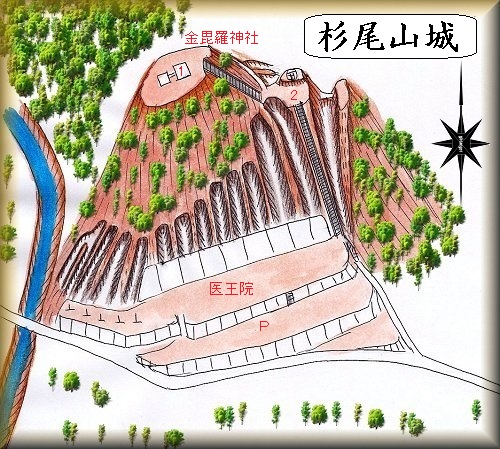 本谷温泉の奥の方に医王院という寺院があるが、その背後の比高50mほどの山稜が杉尾山城の跡である。車のナビには山頂の金毘羅神社が掲載されていたので、それをインプットして進んで行った。