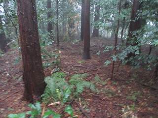 また、案内板の背後には大きな土塁があり、南側からの攻撃に備えている。その背後の南側の尾根続きには小規模ながらも5本の堀切があるらしいのだが、雨ではとても入って行ける状態ではなかった。