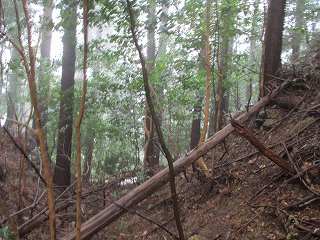 | その先の二重目。 | 下の林道から上を見上げると、堀切が確認できた。 |