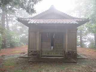 | 石段のすぐ脇には大きな竪堀が見えている。 | 2郭に祭られている祠。 |