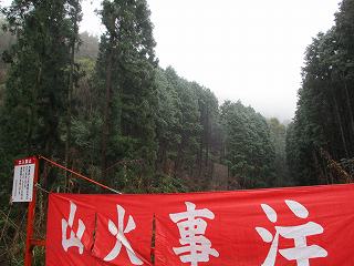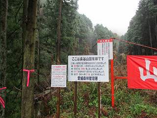 | 山麓の林道入口にある看板。関係者以外立入禁止となっている。 | その奥が高尾山城だが、雨で霞んでよく見えていない。 |