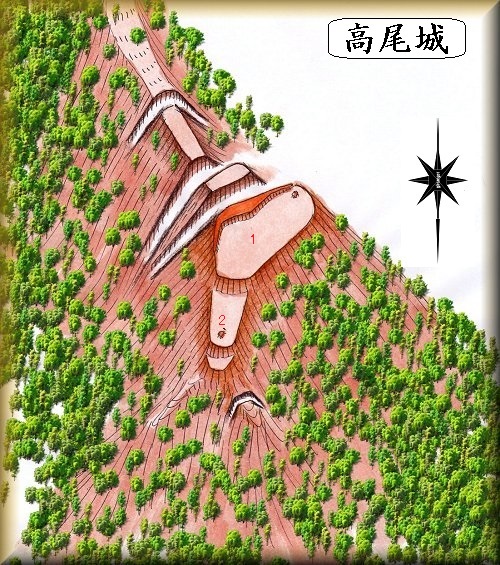 | これだけの遺構を残している城でありながら、その歴史についてはまったく不明である。ということは一時的に取り立てられた陣城であったと見るべき城ではないだろうか。 この地域には見られない巨大な畝状竪堀を有していることなどから、天正13年(1585)に、秀吉の四国攻めの先鋒としてこの地に攻め込んできた小早川隆景が築かせた陣城であった可能性が高いのではないかと考えられる。 |