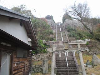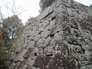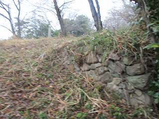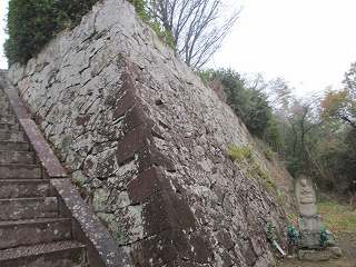 | 南側山麓から見上げる畠山城。かなり急峻な台地である。 | 側面部の石垣。近世城郭のように見事なものだが、これは神社に伴うものであろう。 |