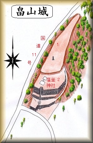 川之江町2440番地の、塩釜神社の建てられている比高30mほどの山稜先端部が、畠山城の跡である。