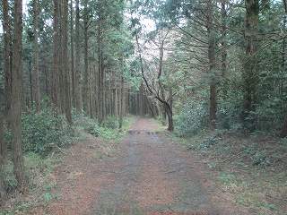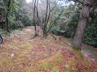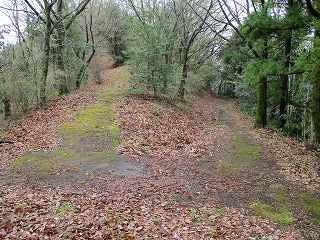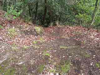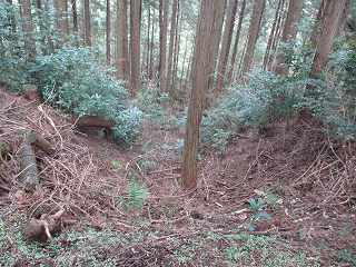 | 1郭通路から見る2郭。 | 2郭の東側の林道にある堀切跡。手前に土塁の痕跡が残っている。 |