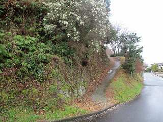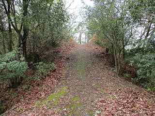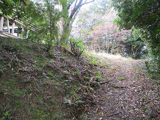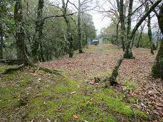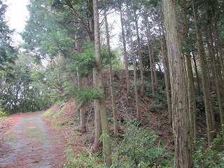 | 城の北側背後にある折り返し道。この左側を上がって行くとすぐに堀切が見えてくる。ここまで車で来ることも可能である。ここに車1台、停められるスペースがある。 | 進んで行くと、2郭jの城塁が見えてきた。 |