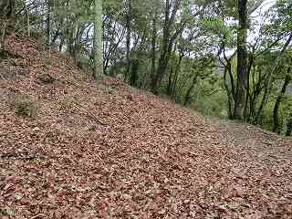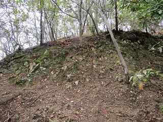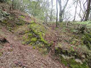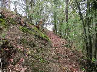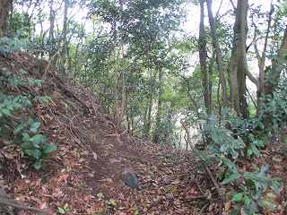 | 堀切の側面部。東側端部分にも土橋がある。 | 1郭の城塁。急峻で、登るのが大変だ。ここは本来の登城ルートではないのであろう。 |