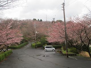 | 登り口から遠望する塩ヶ森城。山頂近くまで車で行ける。 | 山頂下の駐車場。桜が満開であるが、雨のため誰もいない。私の借りたレンタカーがポツンと停まっているだけである。 |