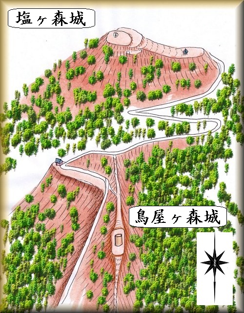 また、塩ヶ森城に向かう途中の馬の背状の山稜部分が鳥屋ヶ森城の跡であり、こちらはgooglemapにも掲載されている。