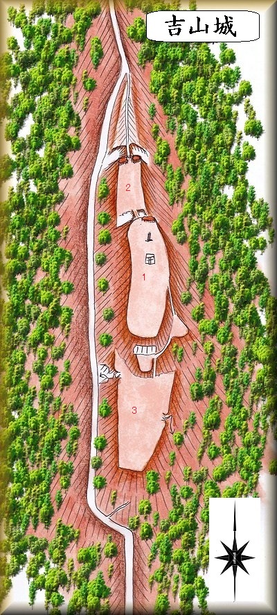 吉山城は、基本的には3つの郭で形成された山城である。郭の削平はしっかりとしており、切岸構造が現在でも鋭く、それなりに防御性を発揮した城郭であったことが分かる。簡単に訪れることもできるので、探索しやすい山城であった。