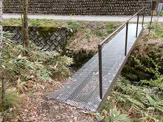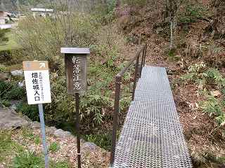 山稜の南端部分に登城口に案内があり、川には質素な鉄製の橋が架けられている。これが登城道の入口である。
