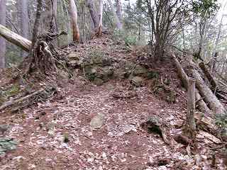 その先の城塁を登ったところが4郭である。ただし、4郭は細尾根を加工したもので、幅が狭く居住には向いていない。
