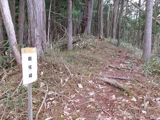 その手前には腰曲輪があり、この南東側に堀切を入れている。その下には多数のテラス状の郭が造成されている。こうした形状からして、南東側の尾根を通るのが大手道だったと考えられているようで、現地の表示もそうなっている。