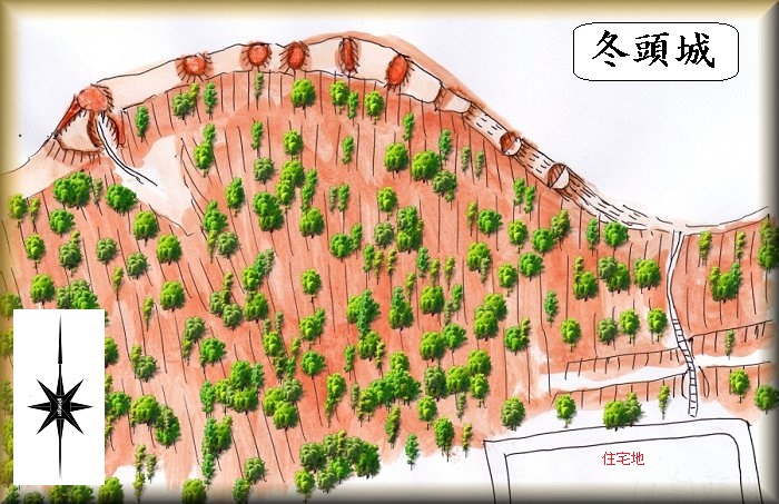 冬頭城は、三枝城の南東1.5kmほどの向かい合うような位置関係にある。冬頭の住宅街のすぐ上の山稜に築かれたものである。