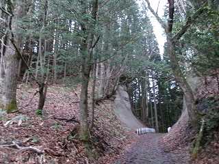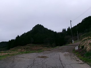 | 東側から。とんがった形の城山である。ピーク部がいかに狭いかは、この形状からしても理解できる。 | 北側の切通し。この手前辺りに車を停められる。 |