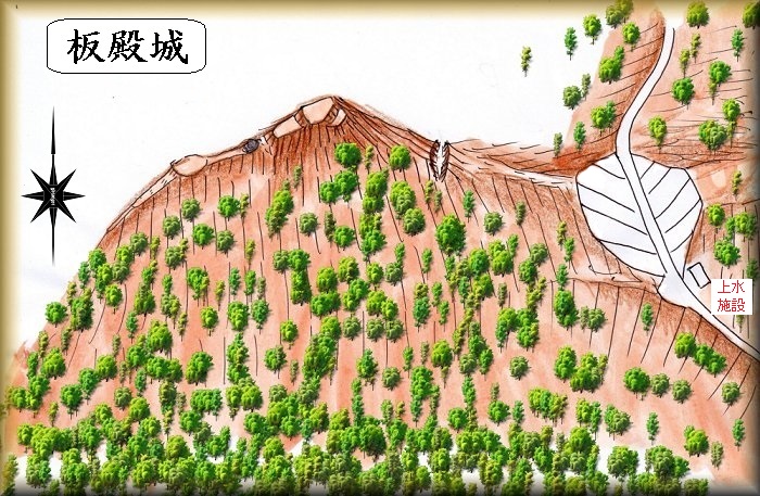 板殿城は、西の笠根城と東のイビキ城との中間地点に位置しており、両者のつなぎの城だった可能性が高いと考えられている。