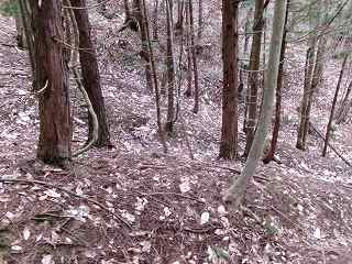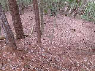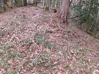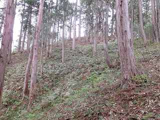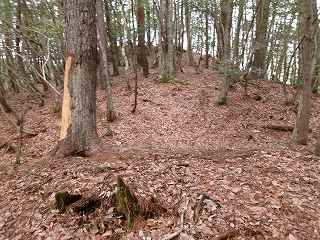 尾根に登って西方に斜面を登って行くと、小規模ながら人工的な切岸地形が2段ほど見えてくる。