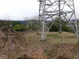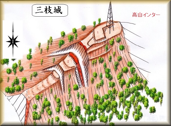 高山ICの南側にそびえている比高70mほどの山稜が三枝城の跡である。先端部を削られてしまっているが、鉄塔が建てられている山なので、いかにも目立っている。