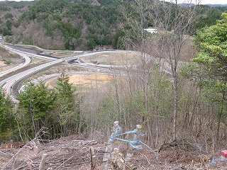そこから左手を見ると、山稜が削られた跡が目に入ってくる。前方のインター方面だけではなく、後方の畑部分も削られてしまっているらしい。これを端の方からよじ登って行く。
