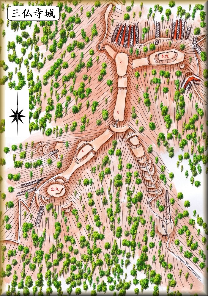 三仏寺城は、それほど技巧的な城郭ではないが、削平された郭の面積は相当数あり、かなりの人数を籠城させられるだけのスペースを有している。