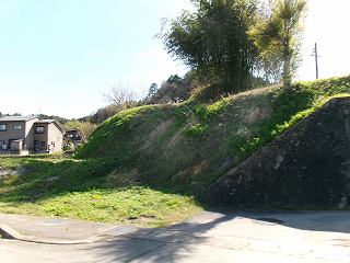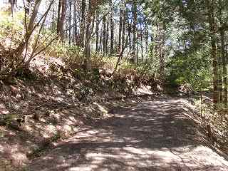 車道がカーブしている地点が砦の基部部分に当たる。本来ならこの部分に堀切を入れるべきところであるが、埋められてしまったのか、現在ではそのような遺構は見られない。